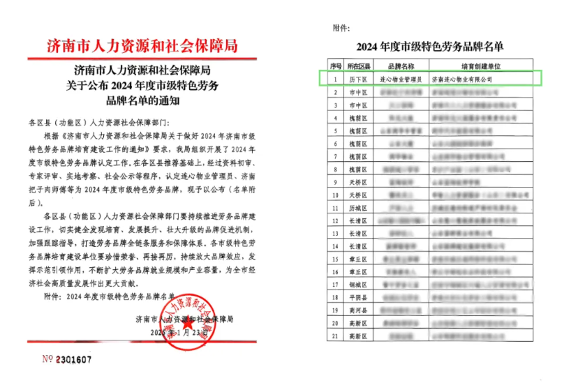2025年10月20日,濟南市人力資源和社會保障局公布2024年度市級特色勞務(wù)品牌名單,濟南連心物業(yè)有限公司“連心物業(yè)管理員”勞務(wù)品牌獲評2024年度市級特色勞務(wù)品牌,成為濟南市物業(yè)服務(wù)行業(yè)品牌建設(shè)標桿。