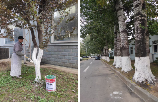 樹木是園區(qū)生態(tài)環(huán)境重要組成部分。為幫助園區(qū)內(nèi)各類喬木、灌木安全越冬,有效防御凍害、日灼(晝夜溫差大導(dǎo)致樹皮開裂)并消滅在樹皮縫隙中越冬的害蟲,項(xiàng)目部組織綠化養(yǎng)護(hù)人員,于十一月上旬集中開展為期一周的“樹木涂白”專項(xiàng)行動(dòng)。 作業(yè)前,對(duì)養(yǎng)護(hù)人員進(jìn)行專項(xiàng)培訓(xùn),明確涂白劑的科學(xué)配比、涂抹高度、均勻度等標(biāo)準(zhǔn)要求。作業(yè)中,工作人員首先對(duì)樹干進(jìn)行清刮處理,去除老皮、蟲卵,然后使用專用工具進(jìn)行規(guī)范涂刷,確保涂白高度整齊劃一,涂層均勻、光滑、美觀,不留死角。此次行動(dòng)共完成園區(qū)主干道、辦公樓周邊、綠地內(nèi)共計(jì)700余株樹木的涂白工作,不僅為樹木穿上了潔白的“防護(hù)服”,也成為冬日?qǐng)@區(qū)一道亮麗風(fēng)景線。