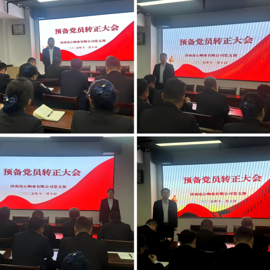 2025年11月10日下午,濟(jì)南連心物業(yè)有限公司黨支部在1701會(huì)議室召開(kāi)第四季度黨員大會(huì),公司全體黨員、入黨積極分子及遞交入黨申請(qǐng)書人員48人參加本次大會(huì)。學(xué)習(xí)黨的二十屆四中全會(huì)精神、審議預(yù)備黨員轉(zhuǎn)正事宜等兩項(xiàng)議程。