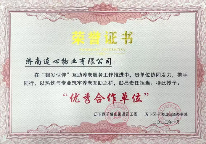 此次獲評“優(yōu)秀合作單位”是對濟南連心物業(yè)社會責任擔當與務實精神的高度認可。作為“銀發(fā)伙伴”項目的重要參與力量,連心物業(yè)充分發(fā)揮服務專業(yè)的優(yōu)勢,積極整合資源、搭建互助平臺、組織為老活動,切實筑牢社區(qū)養(yǎng)老互助橋梁,助力該模式持續(xù)走深走實,推動養(yǎng)老事業(yè)與產業(yè)協(xié)同發(fā)展。