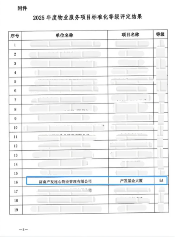 11月4日,濟(jì)南市物業(yè)管理行業(yè)協(xié)會(huì)公布2025年度物業(yè)服務(wù)項(xiàng)目標(biāo)準(zhǔn)化等級(jí)評(píng)定結(jié)果,濟(jì)南連心物業(yè)有限公司服務(wù)的趵突泉釀酒有限責(zé)任公司項(xiàng)目獲評(píng)4A等級(jí),濟(jì)南產(chǎn)發(fā)連心物業(yè)管理有限公司服務(wù)的產(chǎn)發(fā)基金大廈項(xiàng)目獲評(píng)5A等級(jí)。